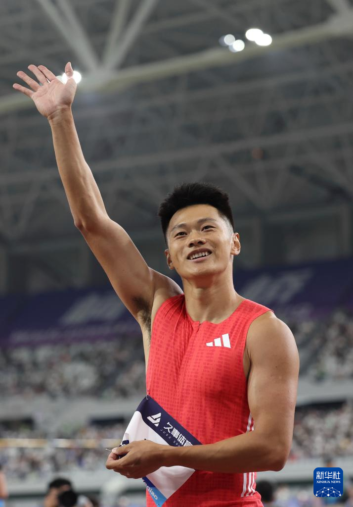 5月3日,中国选手谢震业在男子100米比赛后向观众致意。他以10秒23的成绩获得第八名。