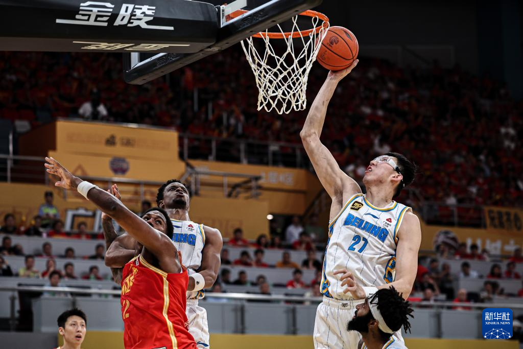 5月7日,北京北汽队球员周琦(右上)在比赛中上篮。
