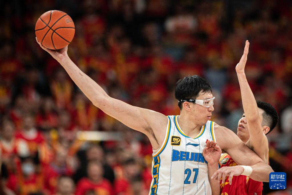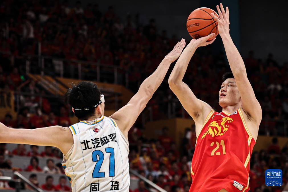 5月7日,北京北汽队球员周琦(左)在比赛中进攻。