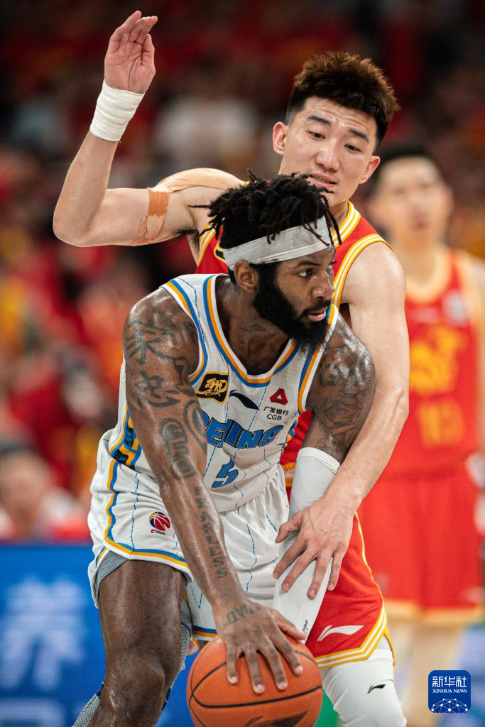 5月7日,浙江方兴渡队球员孙铭徽(后)在比赛中防守北京北汽队球员杰曼。