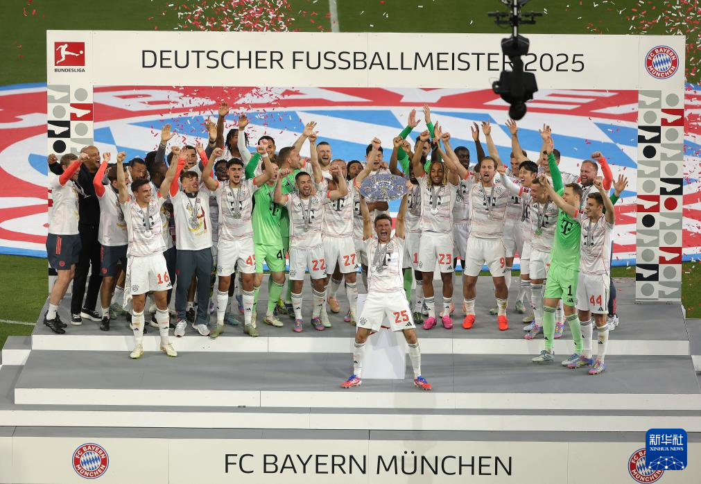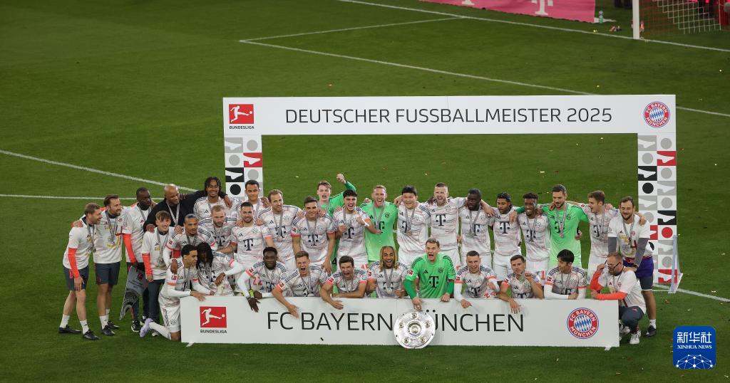 当日,在2024-2025赛季德国足球甲级联赛第33轮比赛中,拜仁慕尼黑队主场2比0战胜门兴格拉德巴赫队。赛后,拜仁慕尼黑队举行颁奖仪式庆祝夺得历史第33个德甲冠军。