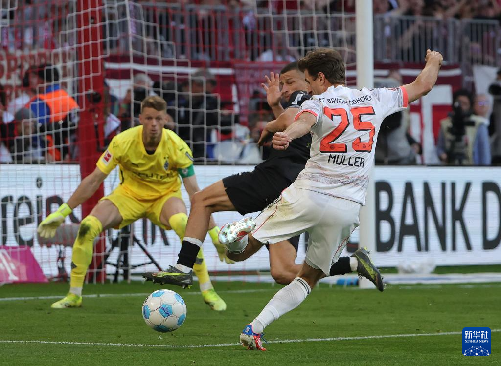 5月10日,拜仁慕尼黑队球员穆勒(前)在比赛中射门。
