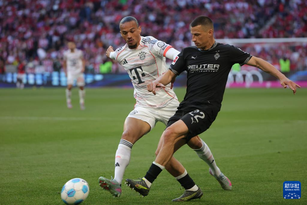 5月10日,拜仁慕尼黑队球员萨内(左)与门兴格拉德巴赫队球员莱纳在比赛中拼抢。