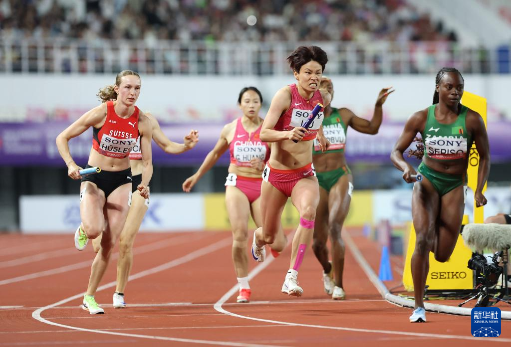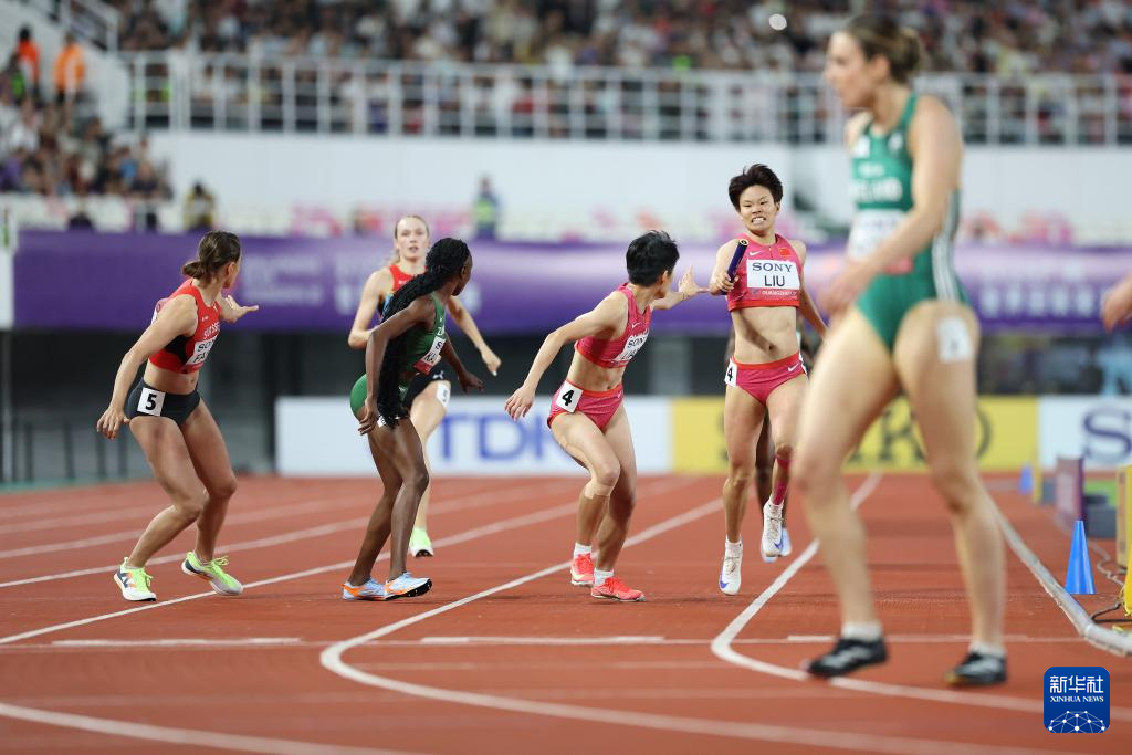 5月11日,中国队第一棒选手周莉(右一)和第二棒选手黄瑰芬(右二)在比赛中交接棒。