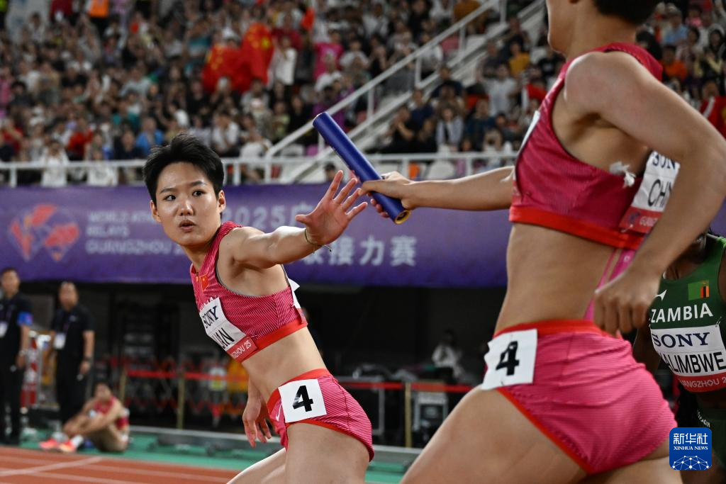 5月11日,中国队第四棒选手连芷(左)在比赛中接棒。