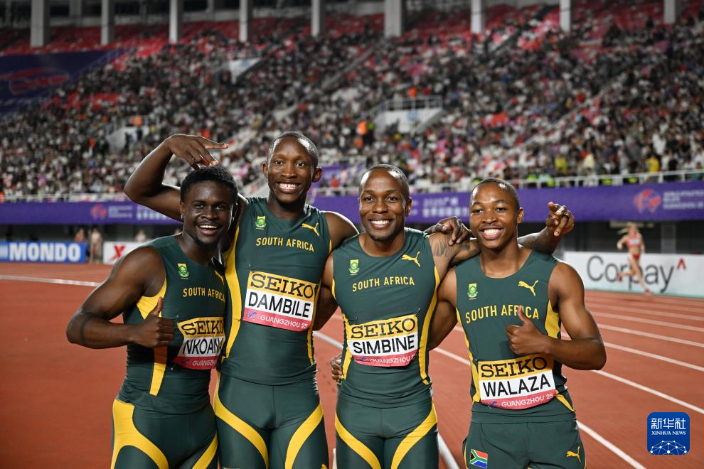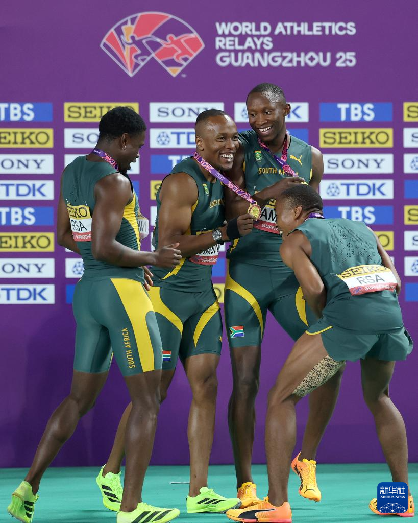 当日,在广州天河体育中心举行的2025年世界田联接力赛男子4x100米决赛中,南非队以37秒61的成绩获得冠军。