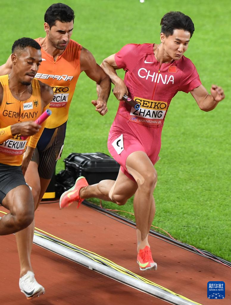 5月11日,中国队第三棒选手张起宁(右)在比赛中。