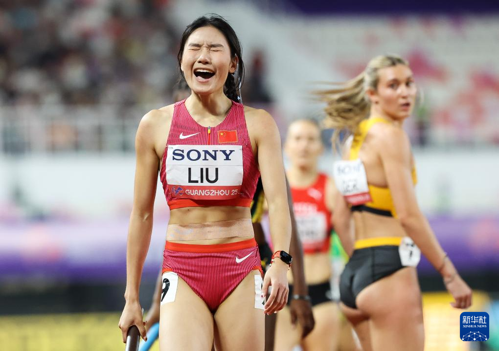 5月11日,中国队第四棒选手刘英兰(前)在冲刺后欢呼。