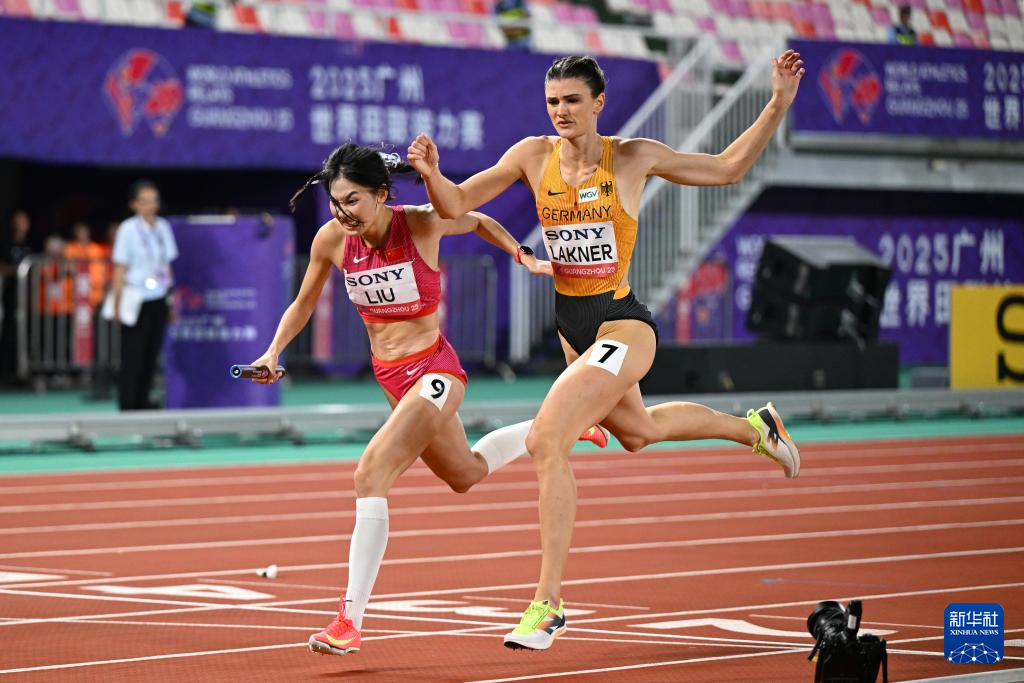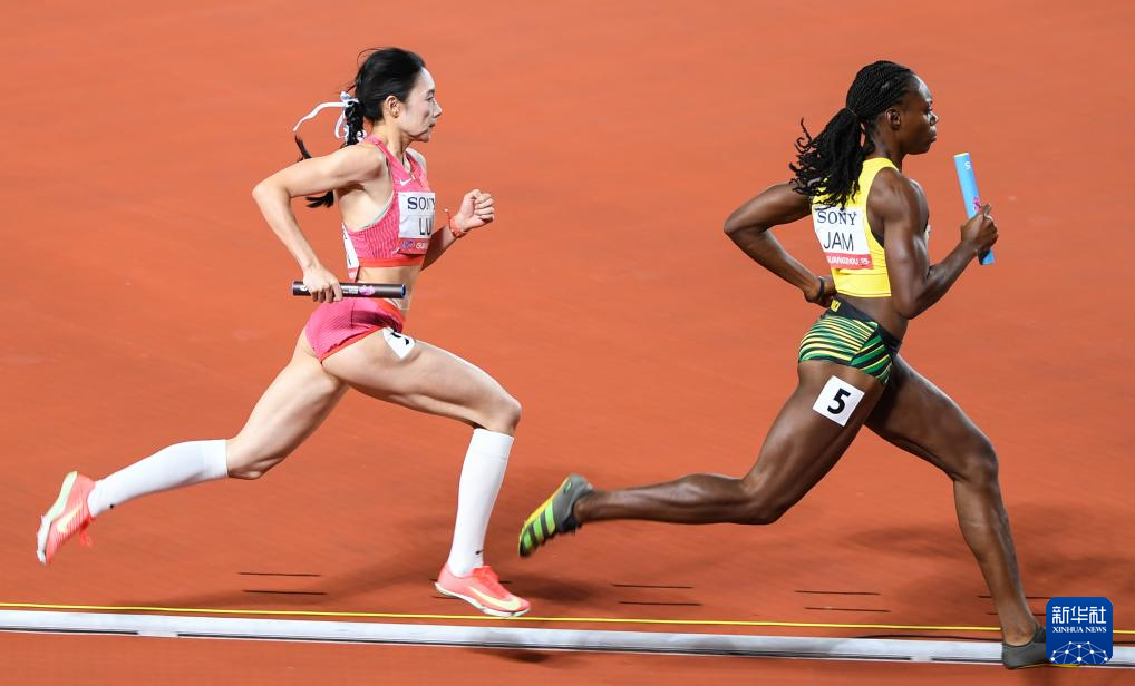 5月11日,中国队第一棒选手梁宝棠(上)和第二棒选手莫家蝶在比赛中交接棒。