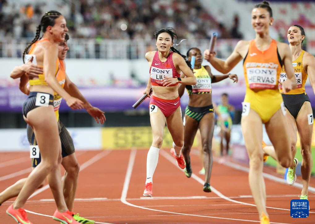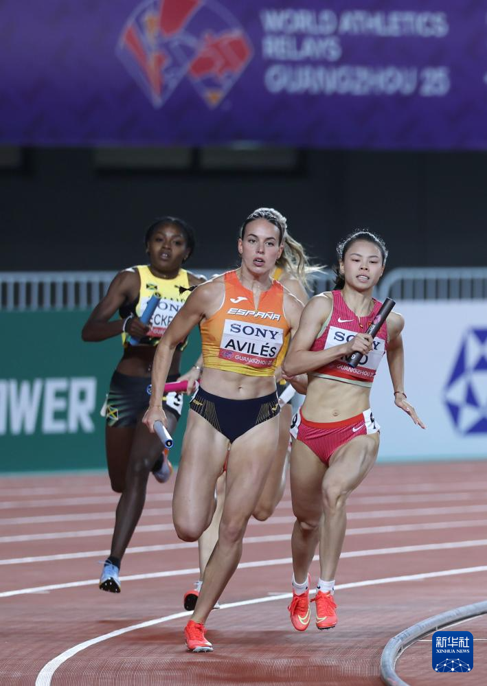 5月11日,中国队第二棒选手莫家蝶(右一)在比赛中准备交棒。
