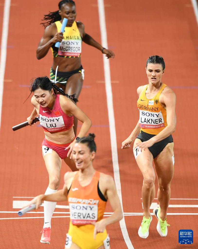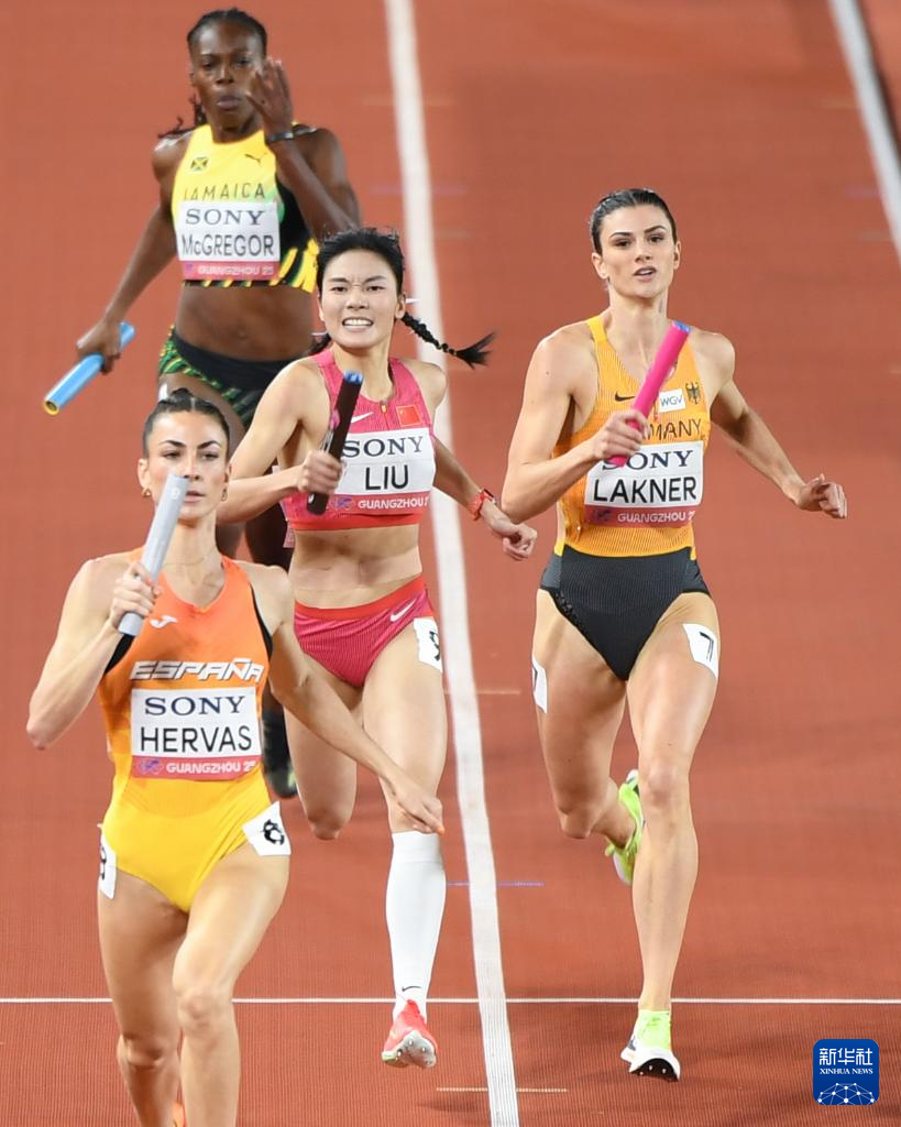 5月11日,中国队第四棒选手刘英兰(右二)在比赛中冲刺。