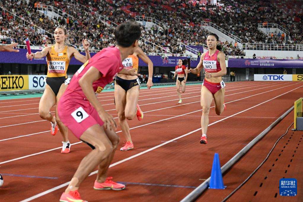 5月11日,中国队第二棒选手莫家蝶(右)和第三棒选手张起宁在比赛中交接棒。