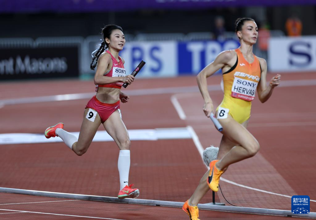 5月11日,中国队第四棒选手刘英兰(左)在比赛中冲刺。