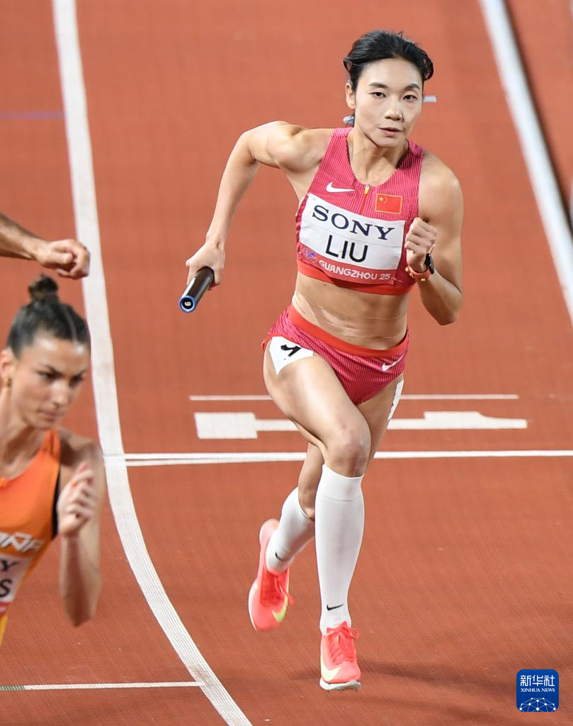 5月11日,中国队第四棒选手刘英兰(中)在比赛中冲刺。