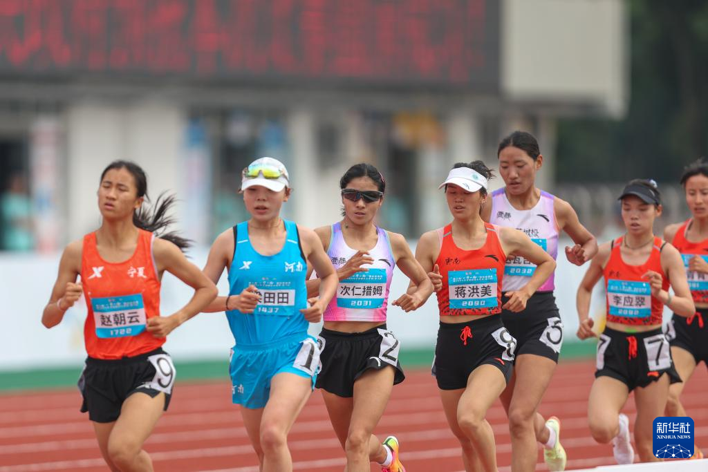 5月14日,河南队选手梁田田(右二)、西藏拉萨城投队选手次仁措姆(右三)、云南队选手蒋洪美(右一)在决赛中。最终,梁田田以16分06秒64的成绩夺得冠军。次仁措姆、蒋洪美分获亚、季军。