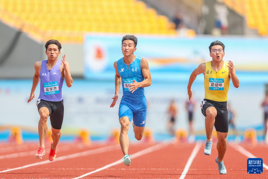 5月14日,吉林队选手陈佳鹏(中)在比赛中。最终,他以10秒37的成绩晋级复赛。