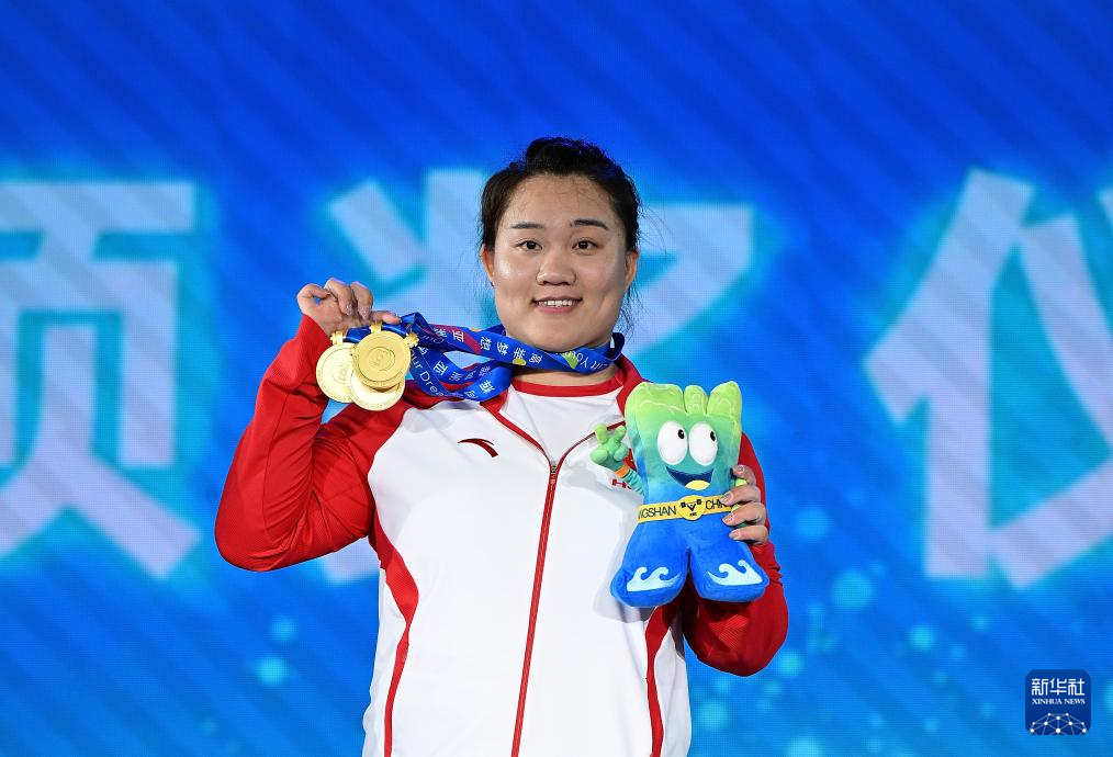 5月13日,中国选手吴艳在颁奖仪式上。最终,她获得抓举、挺举、总成绩三项冠军。