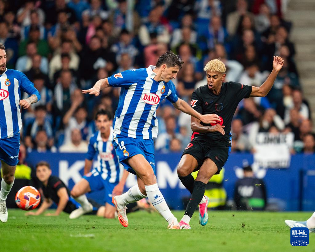 5月15日,巴塞罗那队球员亚马尔(右二)在比赛中传球。