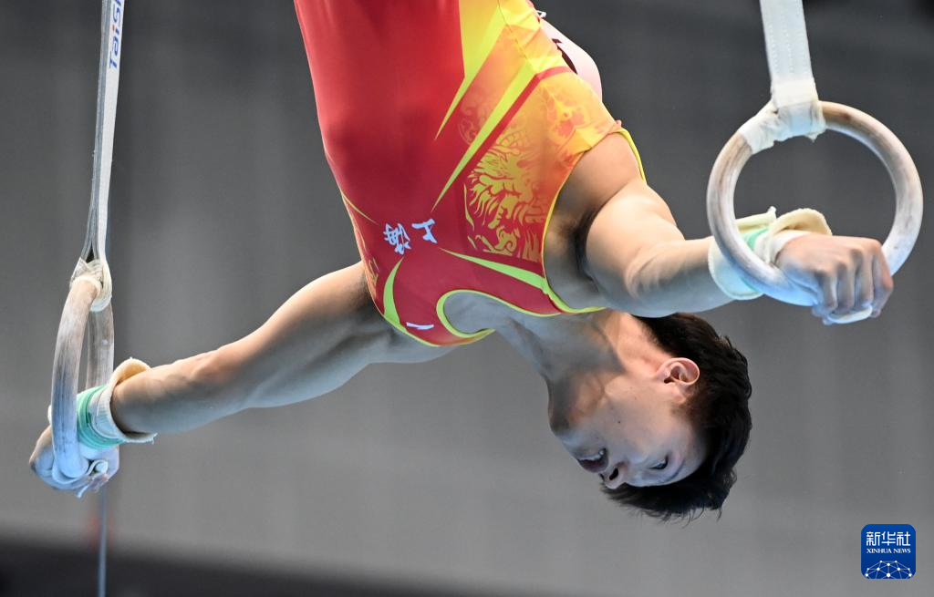 5月15日,上海队选手郑奥在男子预赛吊环比赛中。