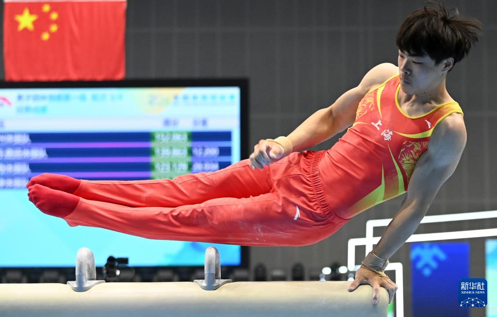 5月15日,天津队选手曾佳林在男子预赛鞍马比赛中。