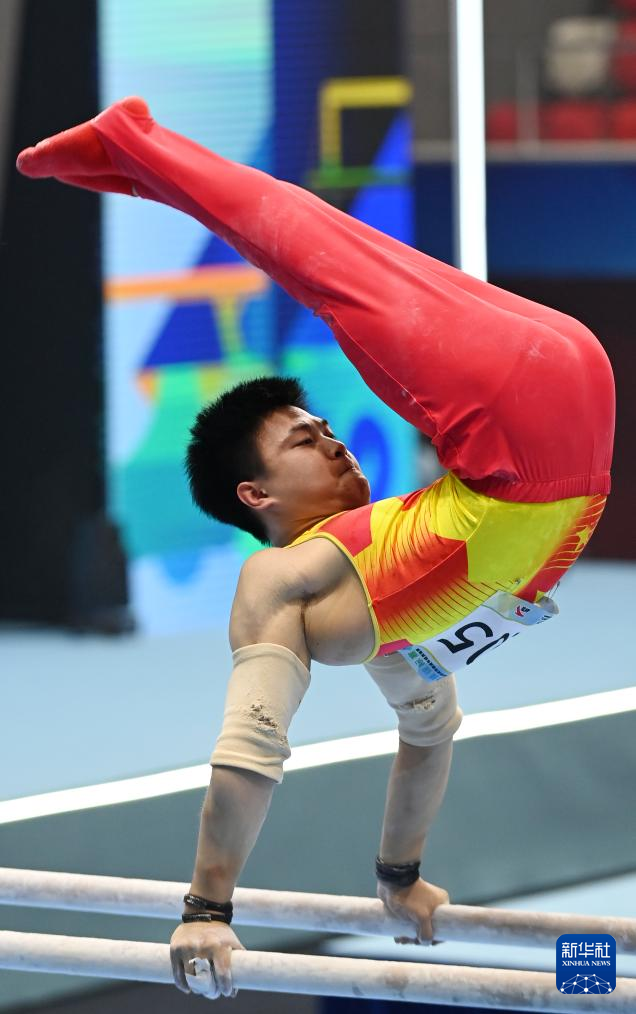 5月15日,湖南队选手李于毅在男子预赛双杠比赛中。