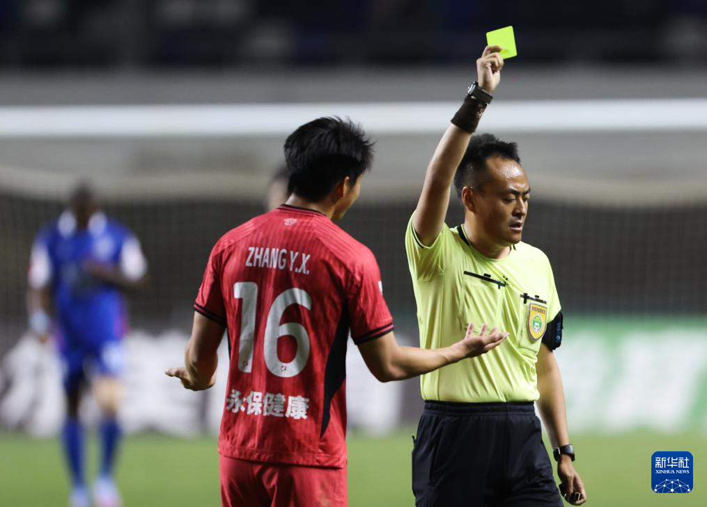 5月17日,主裁判顾中超(右)向青岛红狮队球员张一轩出示黄牌。