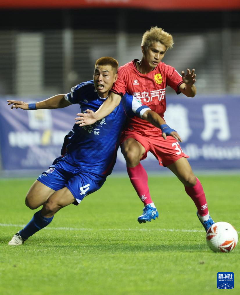 5月17日,石家庄功夫队球员潘奎(右)与青岛红狮队球员陈浩玮在比赛中拼抢。