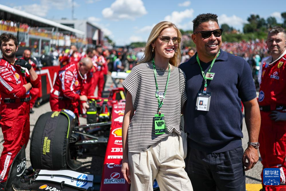 5月18日,巴西足球名宿罗纳尔多(前右)和他的妻子(前左)在赛前留影。