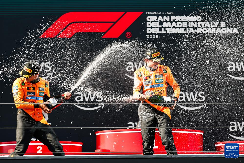 5月18日,亚军迈凯伦车队英国车手诺里斯(左)和季军迈凯伦车队澳大利亚车手皮亚斯特里在颁奖仪式上喷香槟庆祝。