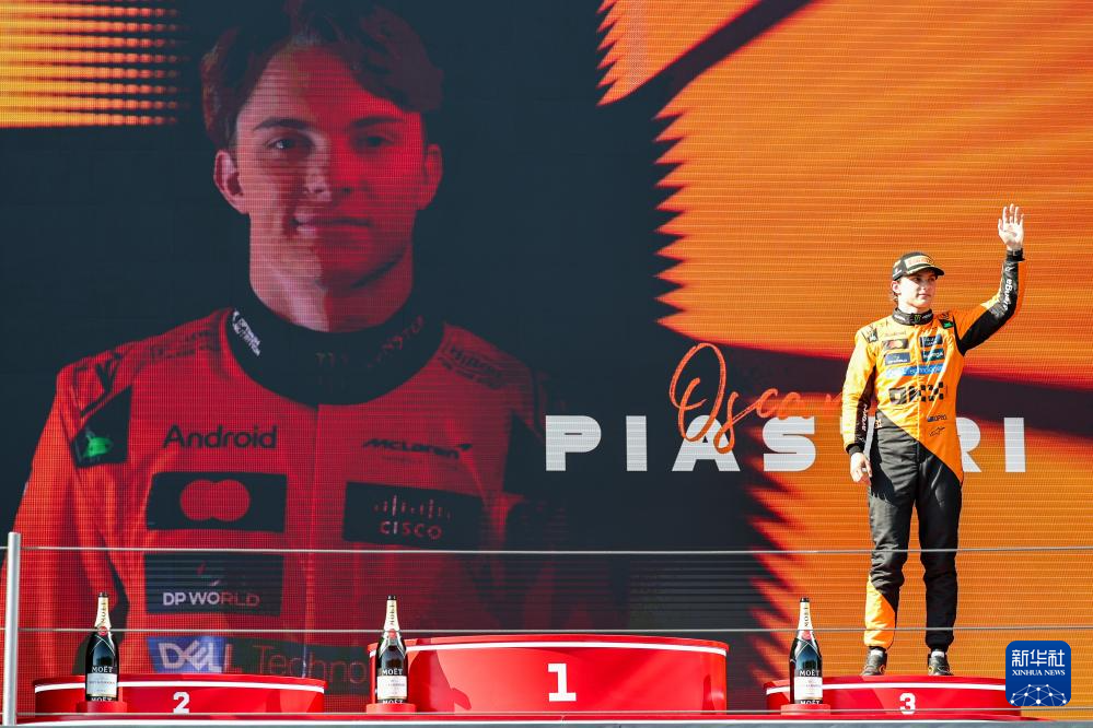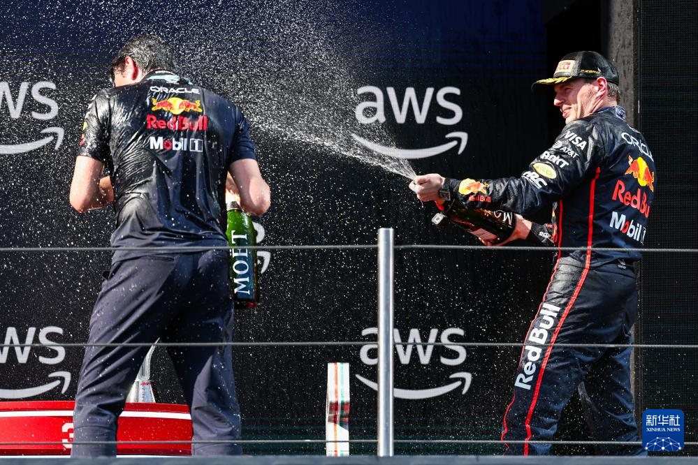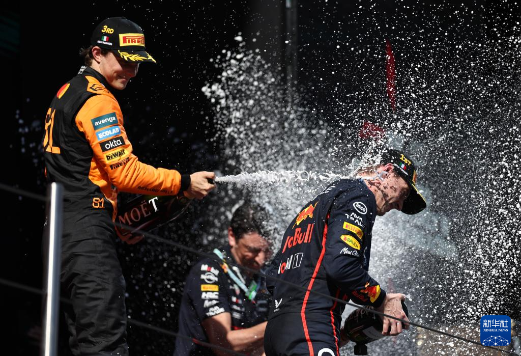 5月18日,季军迈凯伦车队澳大利亚车手皮亚斯特里(左)在颁奖仪式上向冠军红牛车队荷兰车手维斯塔潘喷香槟庆祝。