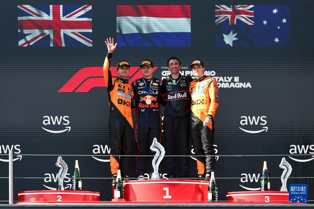 5月18日,冠军红牛车队荷兰车手维斯塔潘(左二)、亚军迈凯伦车队英国车手诺里斯(左一)和季军迈凯伦车队澳大利亚车手皮亚斯特里(右一)在颁奖仪式上合影。