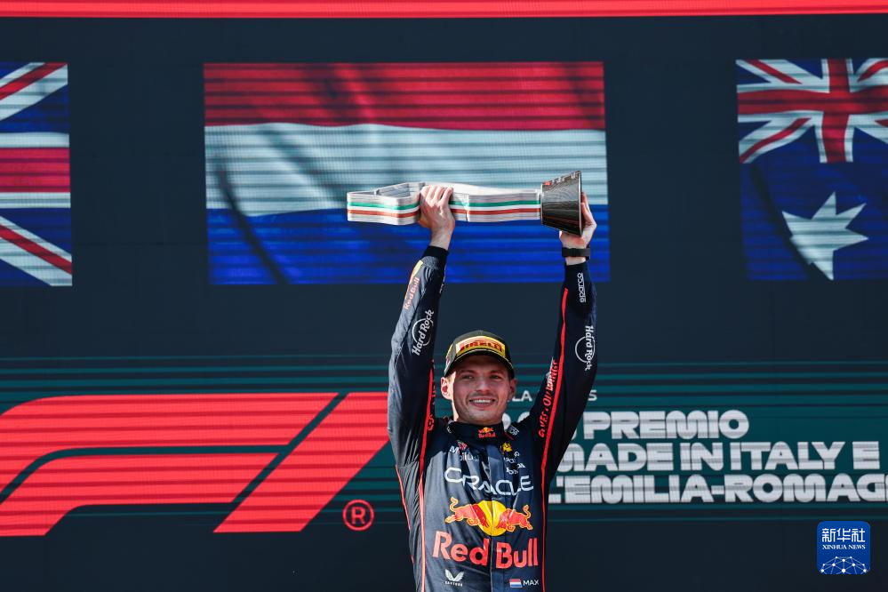 5月18日,冠军红牛车队荷兰车手维斯塔潘(右)在颁奖仪式上。
