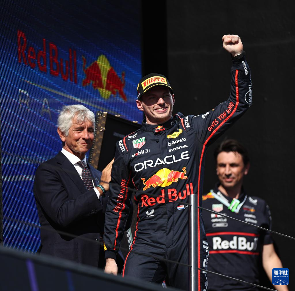 5月18日,冠军红牛车队荷兰车手维斯塔潘(中)在颁奖仪式上庆祝胜利。