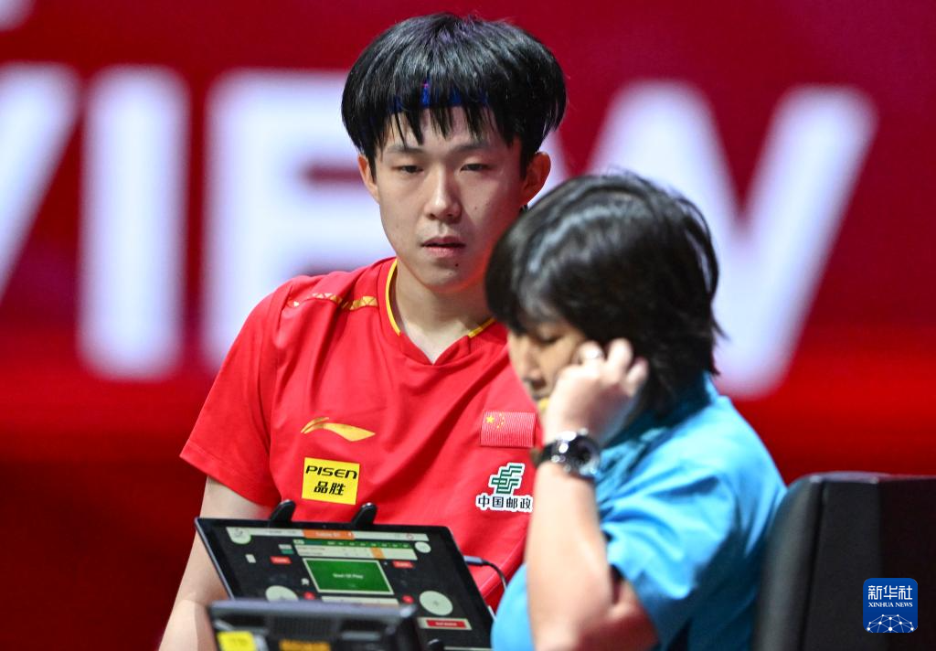 5月20日,王楚钦(右)在比赛间隙接受教练王皓的指导。