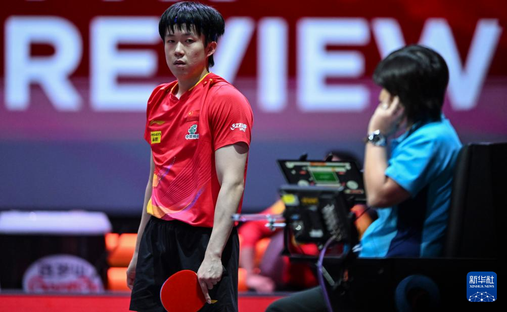 5月20日,王楚钦在比赛中向裁判申请鹰眼挑战。