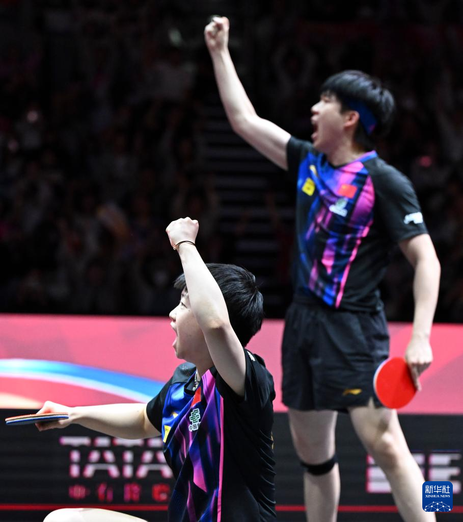 5月22日,王楚钦(右)/孙颖莎在比赛中庆祝。
