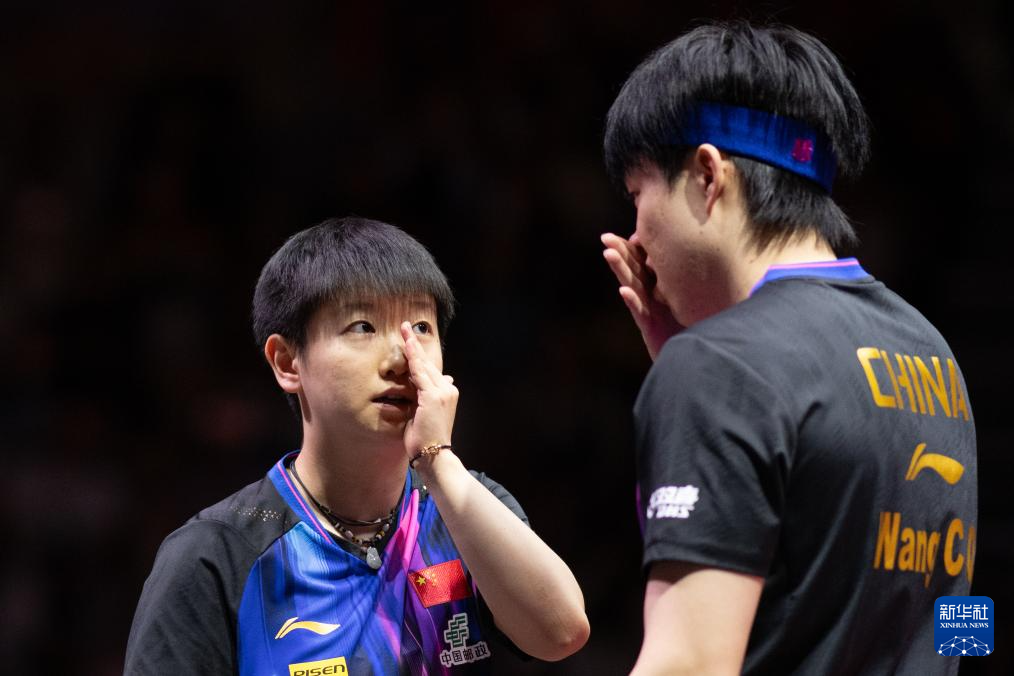 5月22日,王楚钦/孙颖莎(左)在比赛中交流。