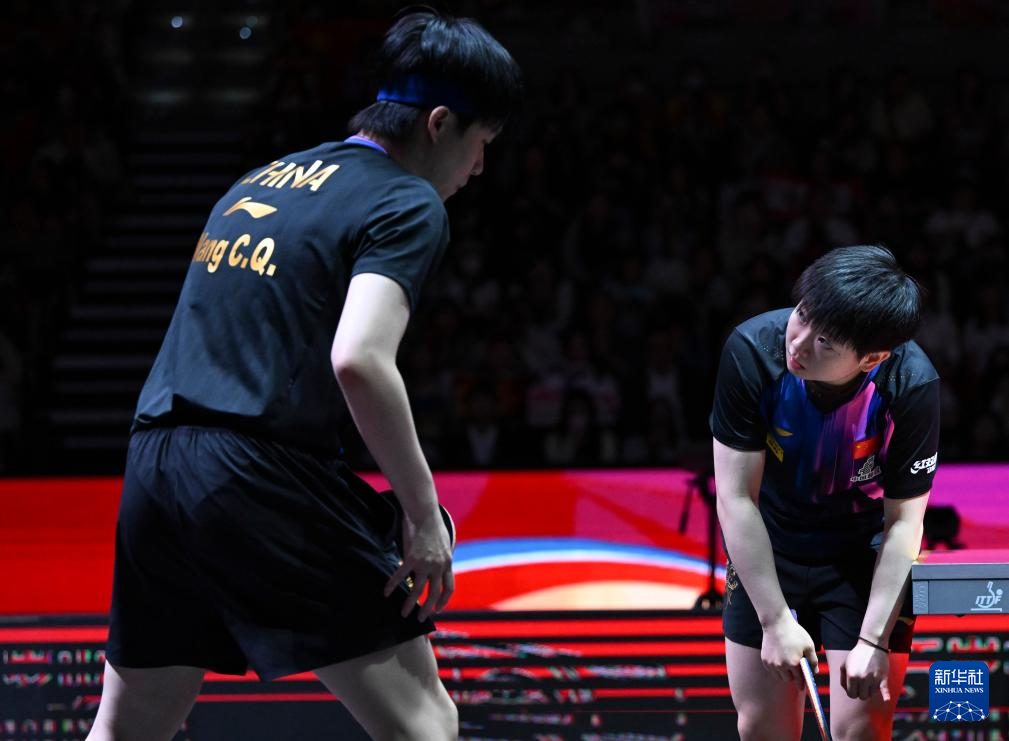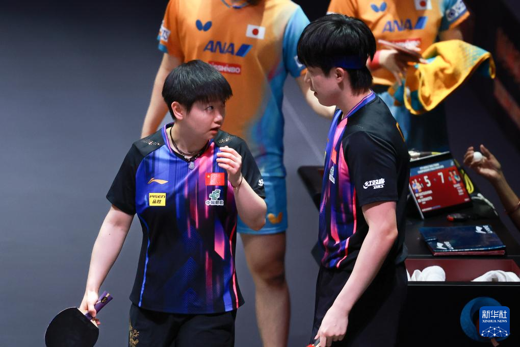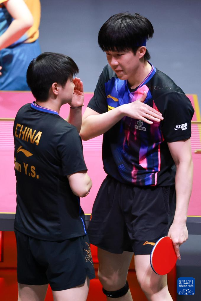 5月22日,王楚钦(右)/孙颖莎在比赛中交流。