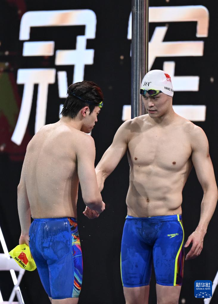 5月22日,浙江寿仙谷队选手孙杨(右)在赛后与队友潘展乐握手庆祝。