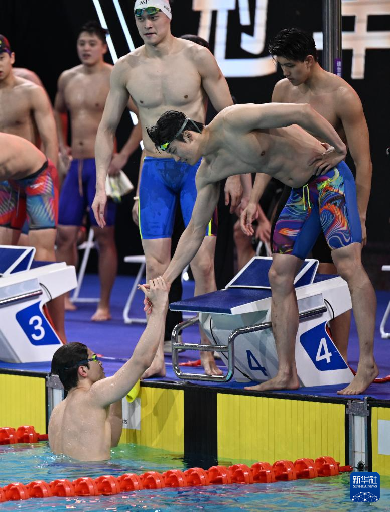 5月22日,浙江寿仙谷队第四棒选手潘展乐(下)在比赛后与队友汪顺(右前)握手庆祝。