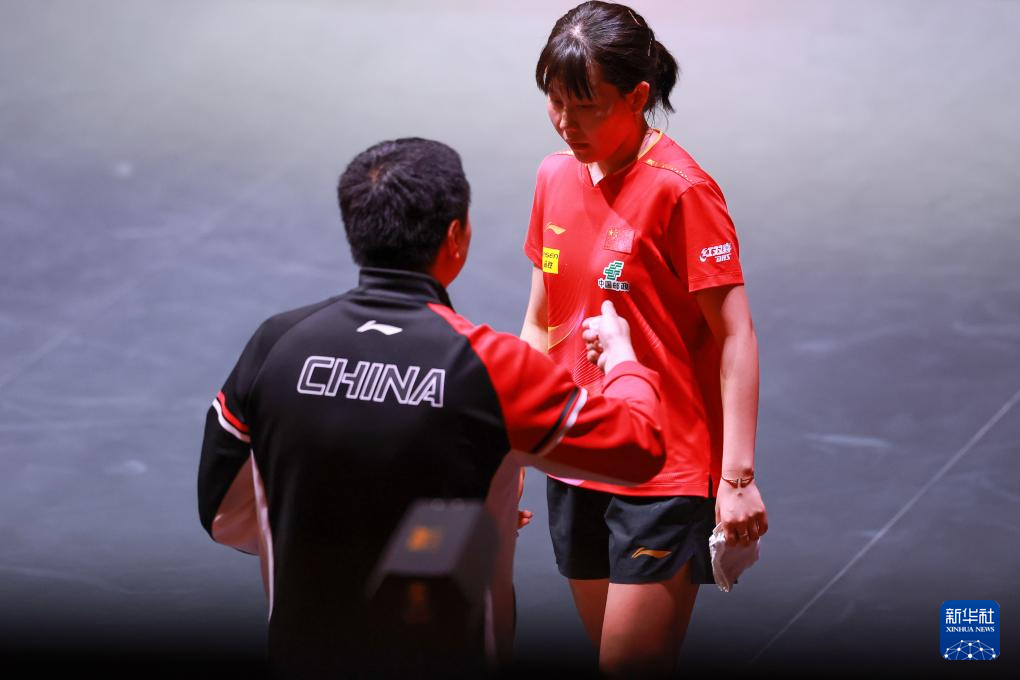 5月23日,陈幸同(右)在比赛间隙接受教练邱贻可指导。