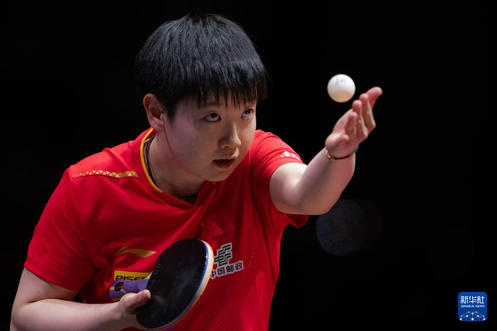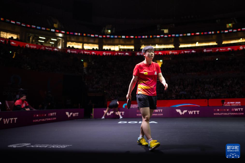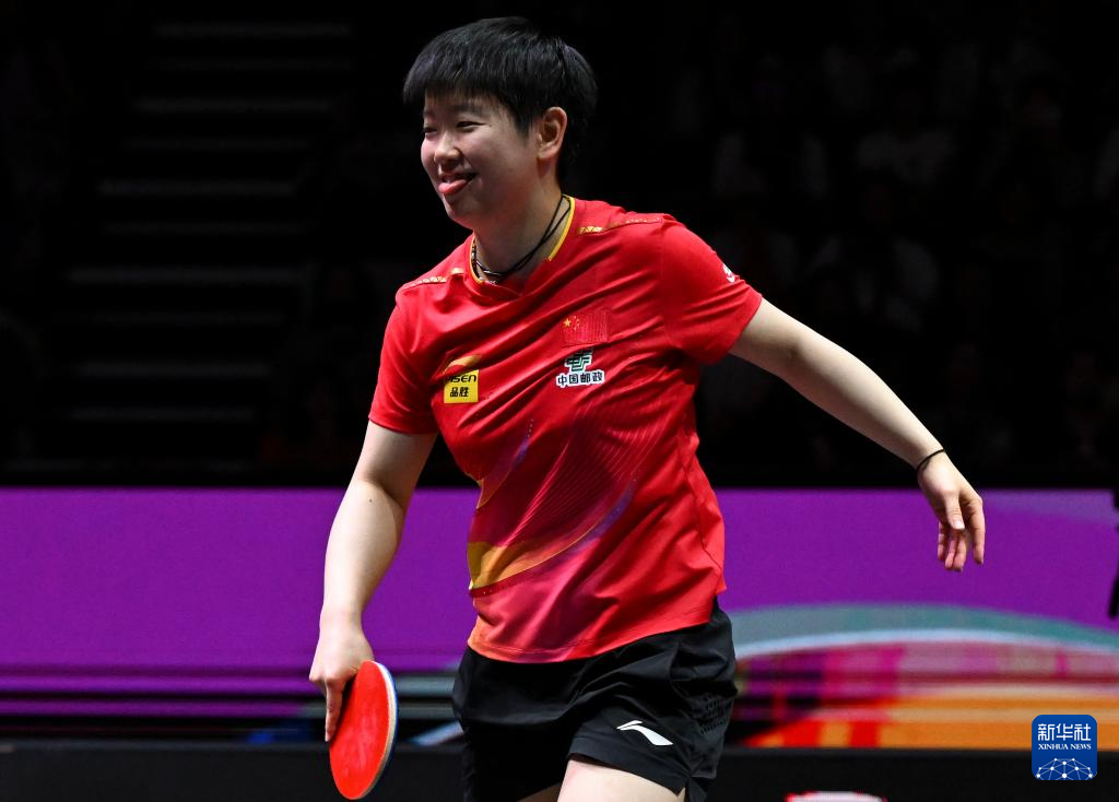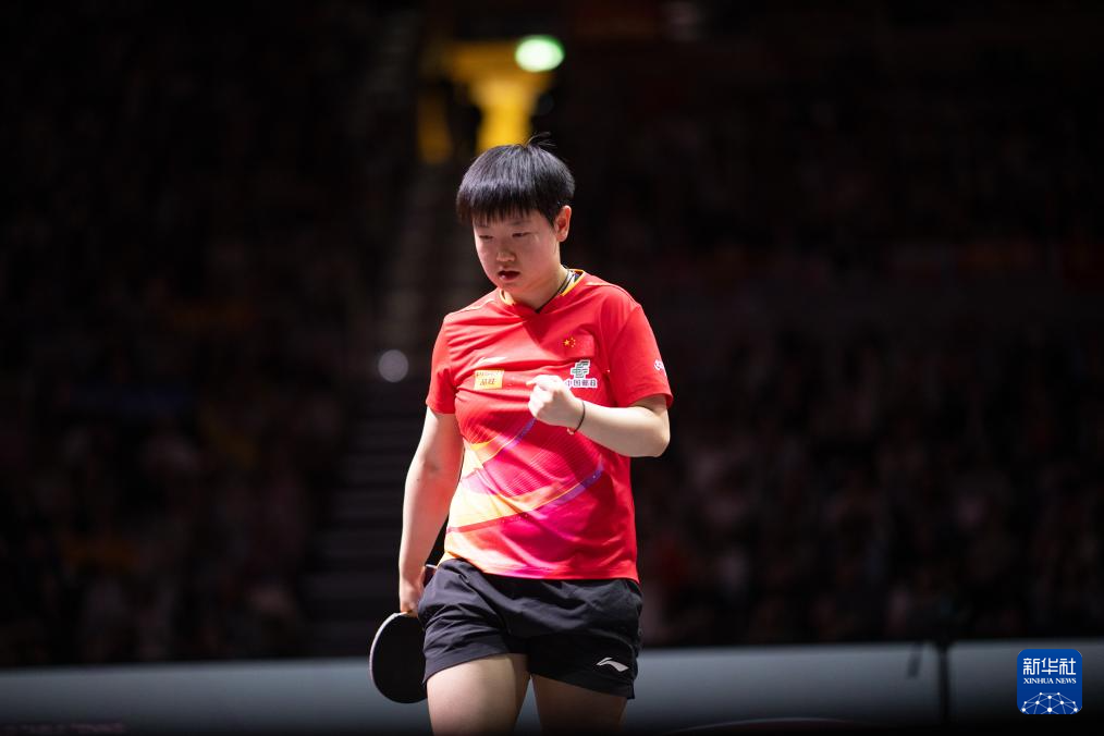 5月23日,孙颖莎(左)在比赛中庆祝得分。