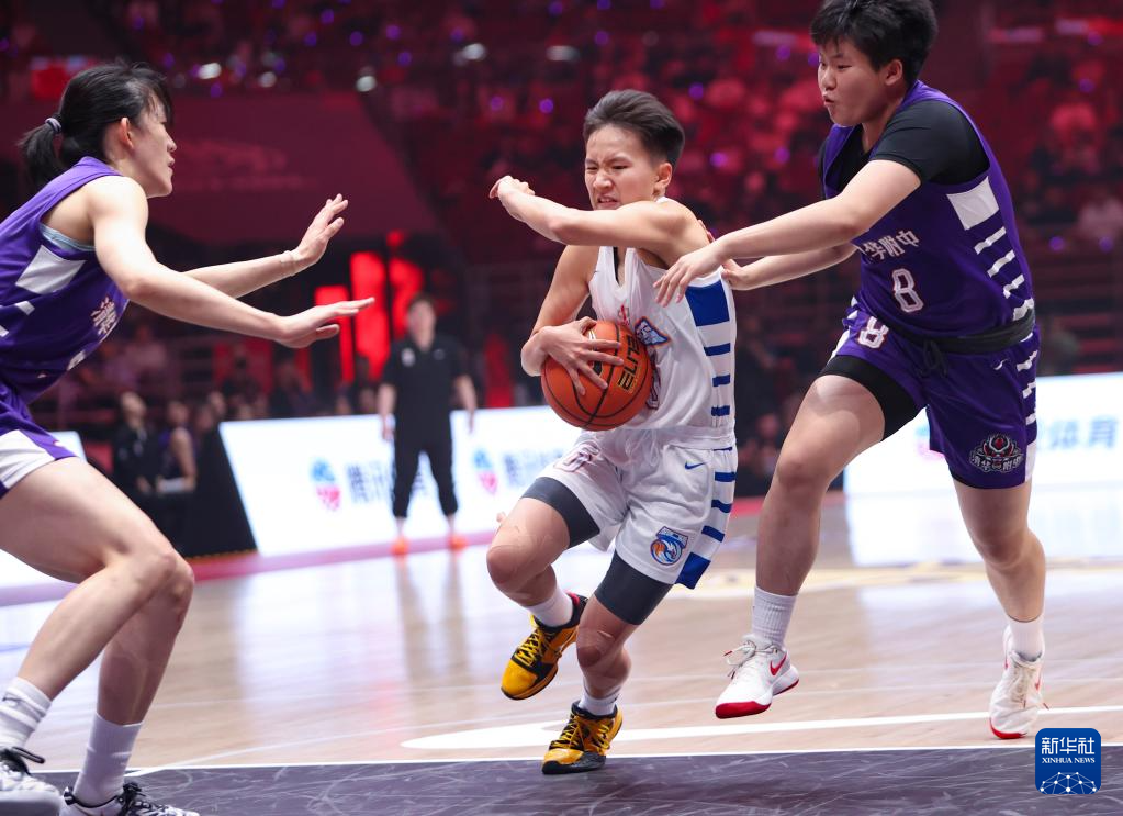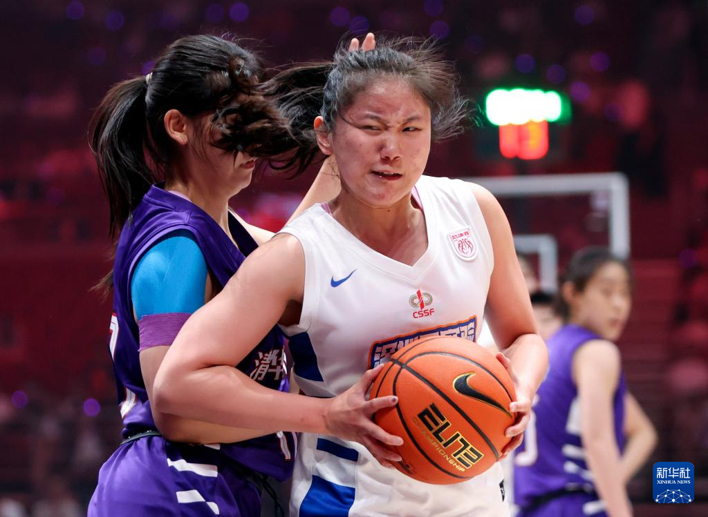 5月25日,清华大学附属中学队球员梁雅琦(中)在比赛中上篮受阻。