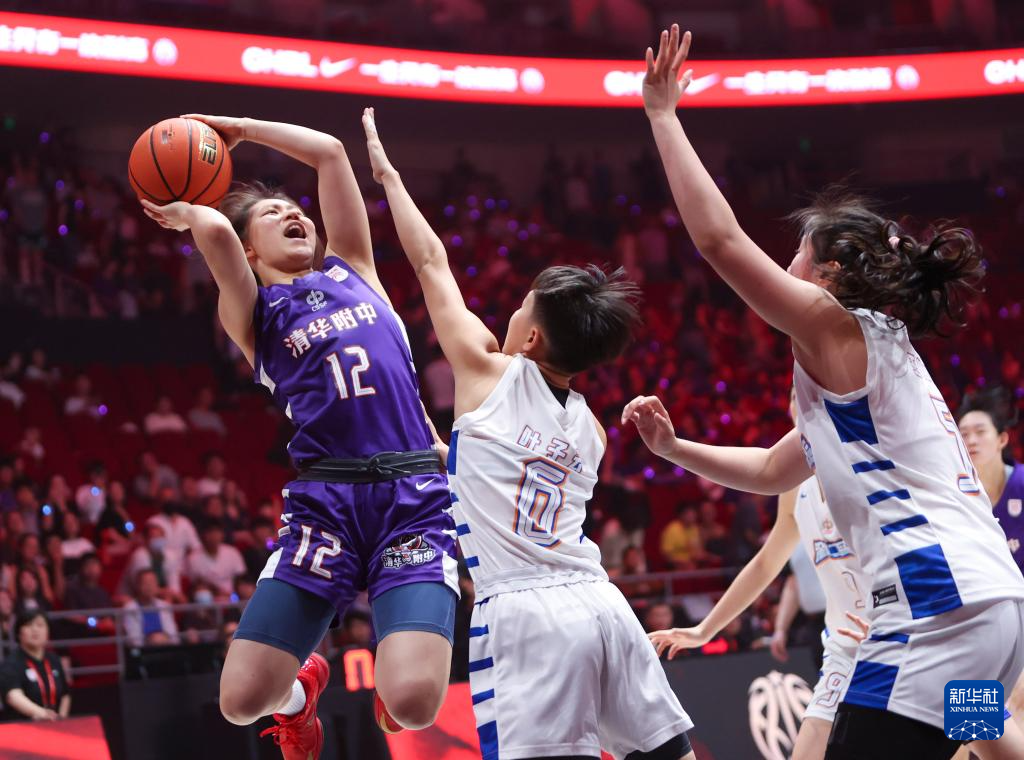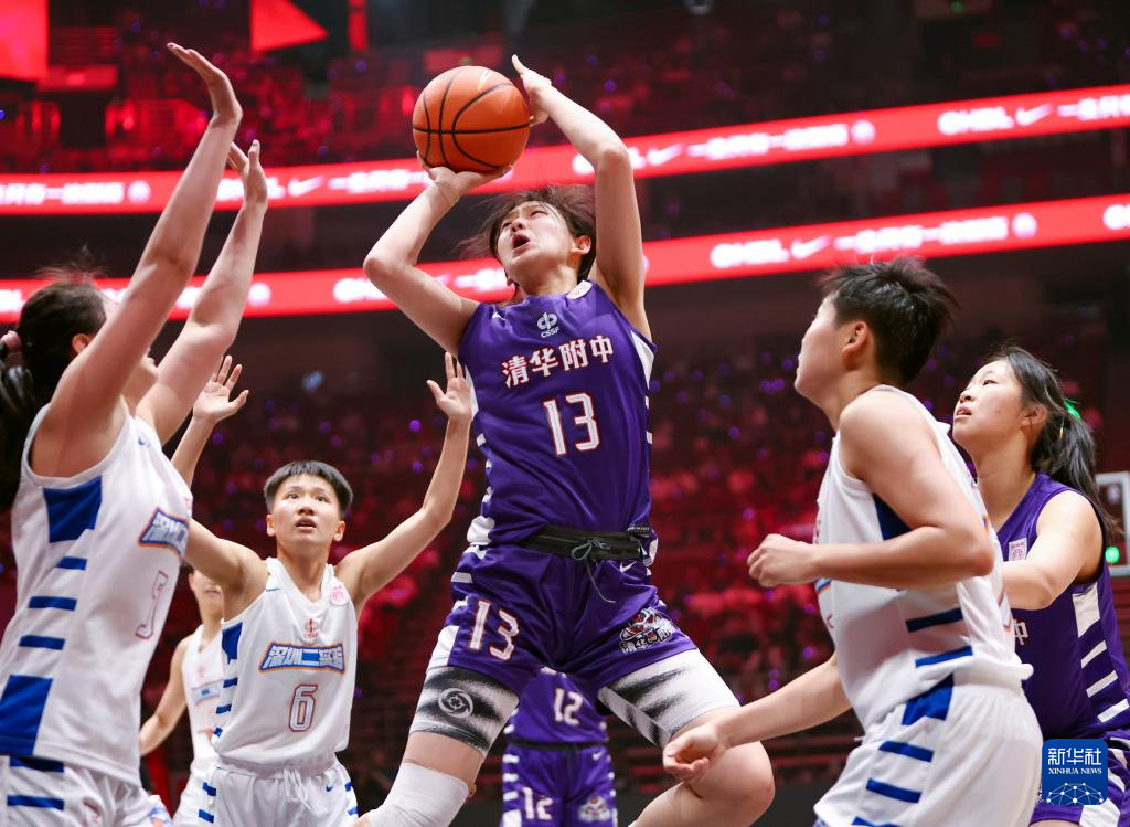 5月25日,清华大学附属中学队球员蒋紫涵(中)在比赛中投篮。