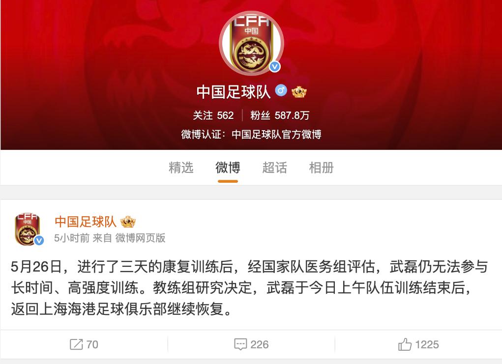 国足在官方微博中写道:“5月26日,进行了三天的康复训练后,经国家队医务组评估,武磊仍无法参与长时间、高强度训练。教练组研究决定,武磊于今日上午队伍训练结束后,返回上海海港足球俱乐部继续恢复。”