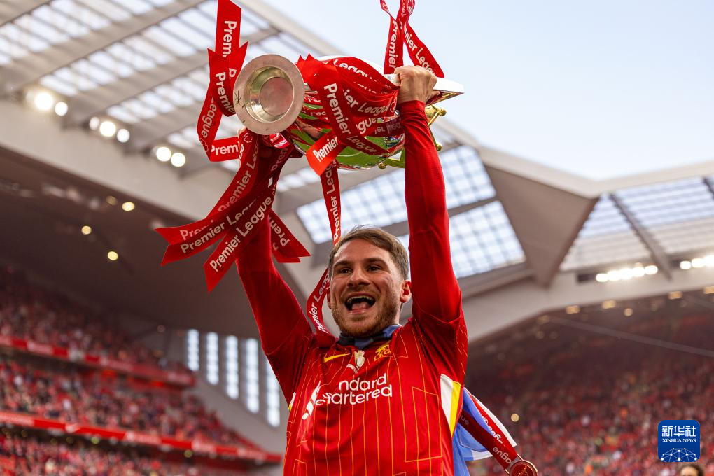 5月25日,利物浦队球员麦卡利斯特高举冠军奖杯庆祝。