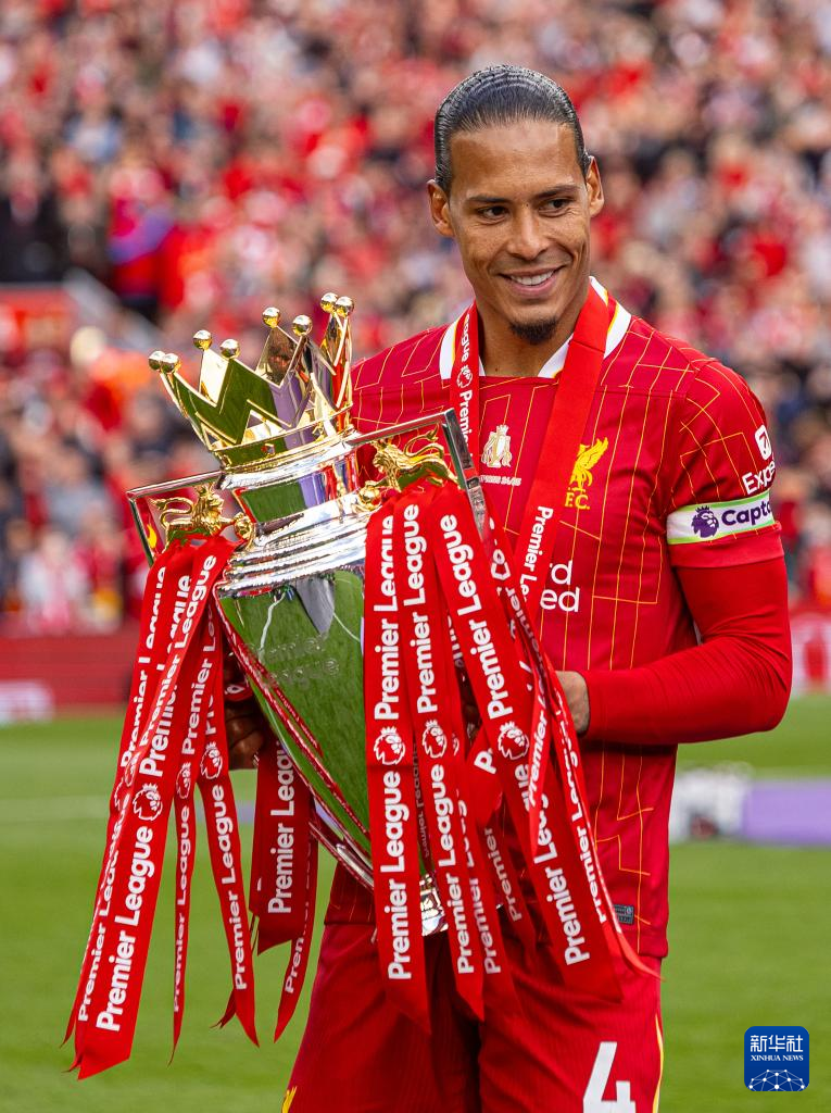 5月25日,利物浦队队长范戴克手持冠军奖杯。