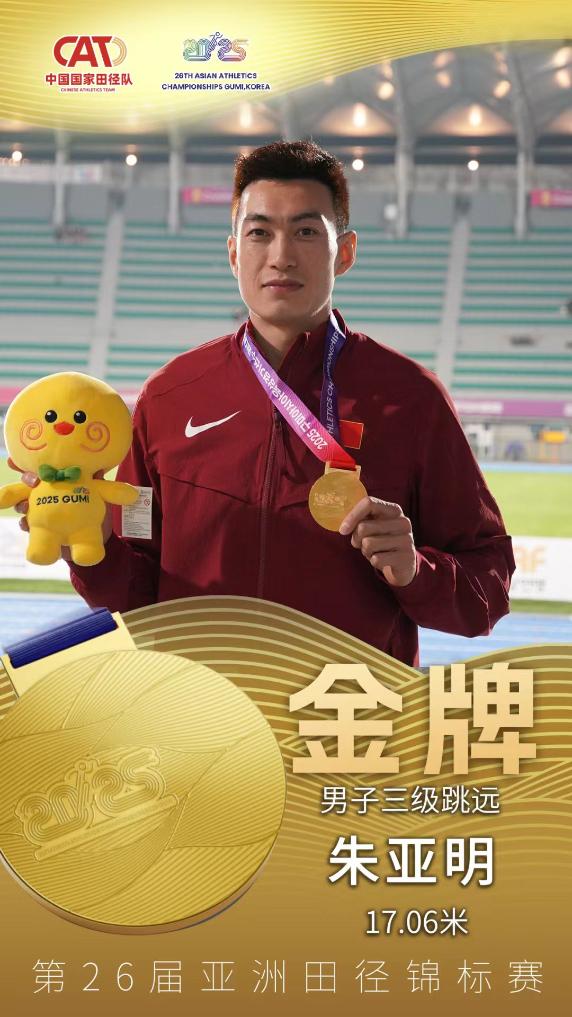 男子三级跳远比赛中,东京奥运会银牌得主朱亚明第一轮就跳出17米06的成绩,奠定胜局。他也是全场比赛唯一突破17米的运动员,此后第二轮中朱亚明还跳出过17米01。获得亚军的印度选手奇斯拉韦尔成绩是16米90。