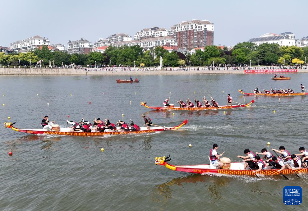 5月29日,参赛队伍在12人龙舟100米比赛中(无人机照片)。