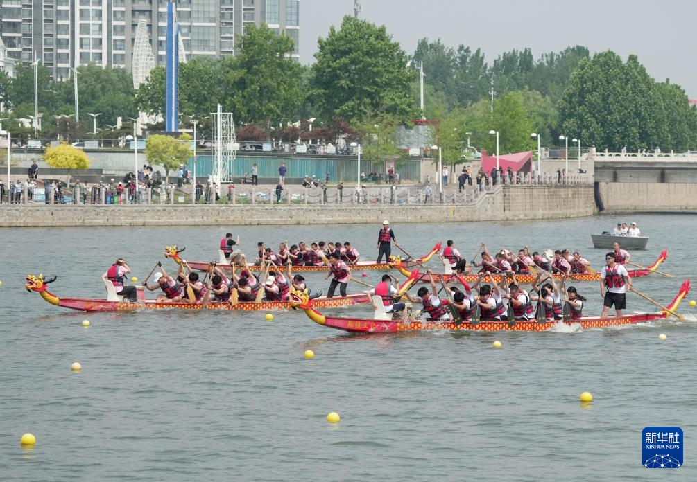 5月29日,参赛队伍在12人龙舟200米比赛中。